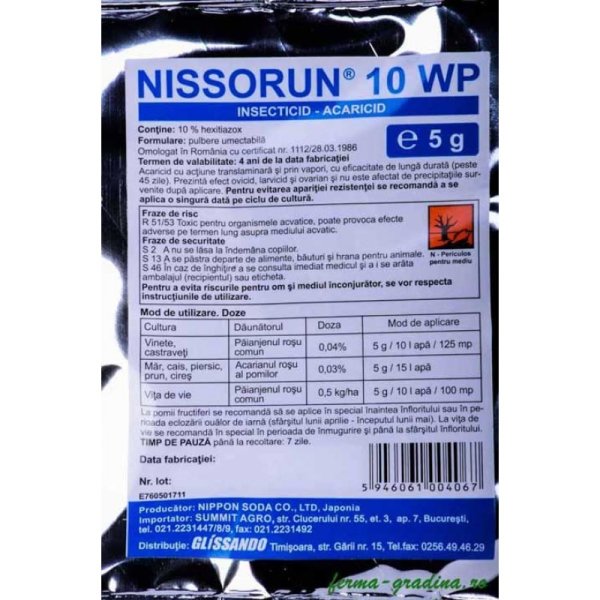 NISSORUN 10 WP este un acaricid foarte eficace impotriva paienjenilor din livezi, vii si culturile de legume.
