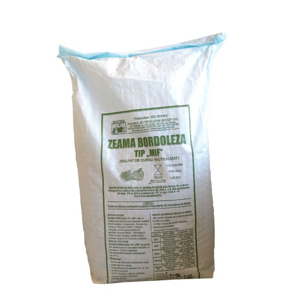 Zeama Bordeleza tip MIF este un produs fungicid sub forma de pulbere umectabila omogena cu continut de substanta activa 20% cupru metallic sub forma de sulfat de cupru neutralizat a carui subspensie de 1% in apa are un PH cuprins intre 6-8 unitati PH. Este un fungicid care asigura o buna protectie impotriva focului bacterian al rozaceelor (Erwinia amzlovora) al Rapanului merilor (venturia inaequalis) si al manei vitei de vie (plasmopara viticola).